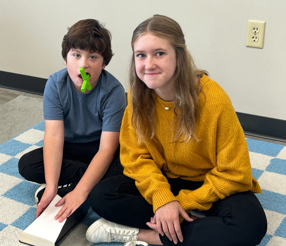 Evan Patterson, left, sitting with volunteer Macy Segrest at Pear Orchard Presbyterian Church. Photo courtesy of Daphne Clark