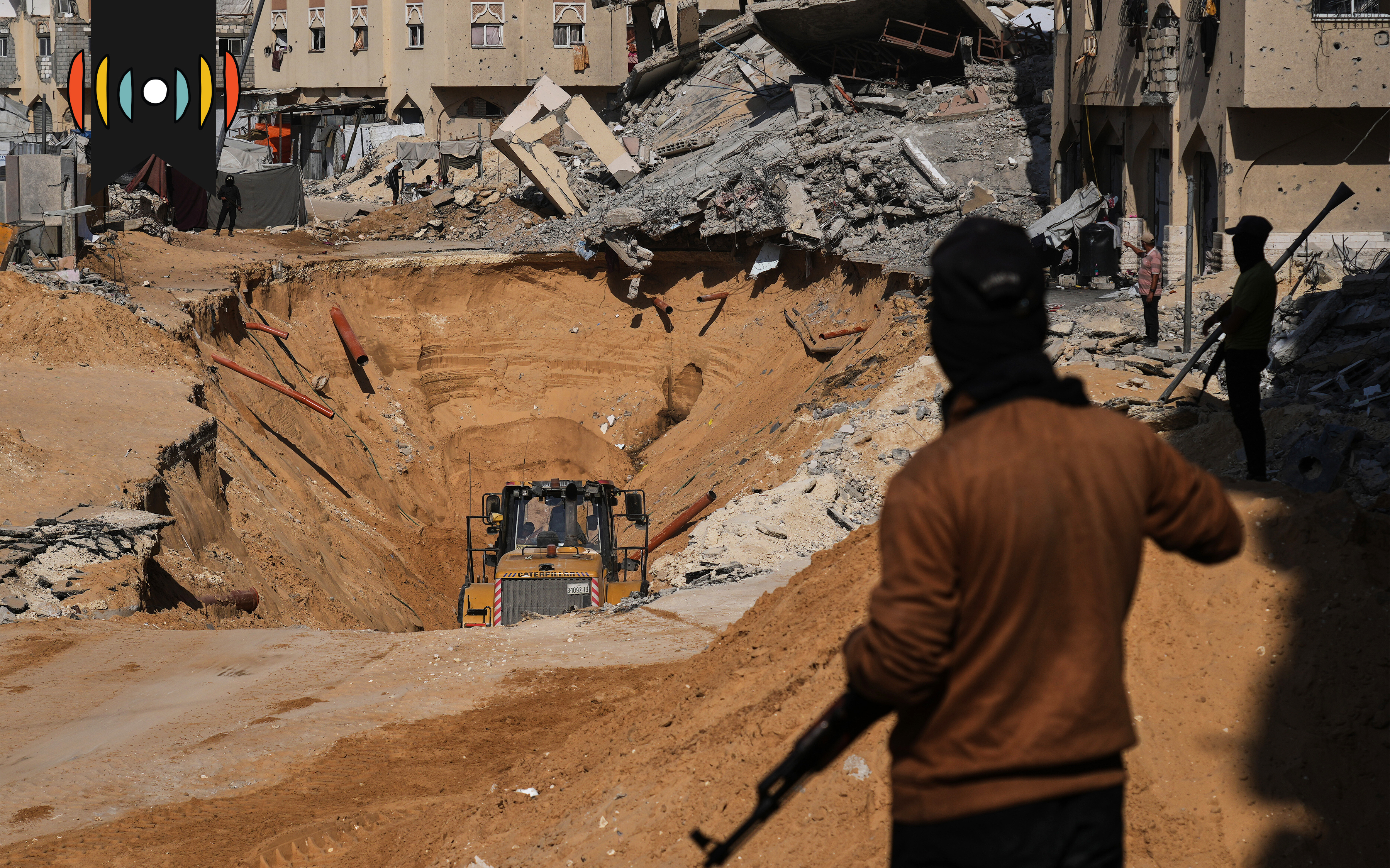 Members of Hamas search underground for the bodies of Israeli hostages amid destroyed buildings in the southern Gaza Strip, Sunday. Associated Press / Photo by Abdel Kareem Hana