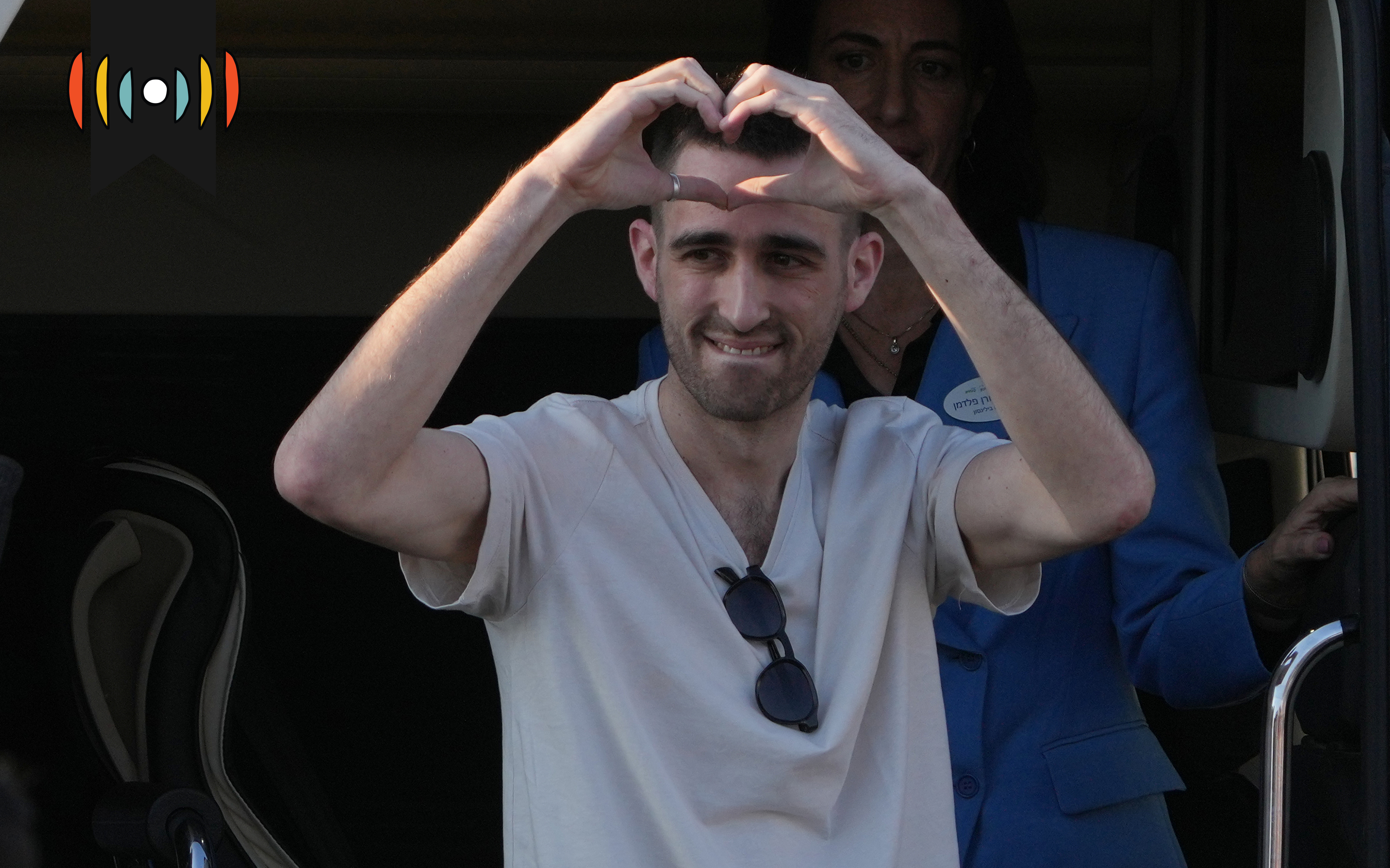 Freed Israeli hostage Avinatan Or gestures from a van as he arrives at Beilinson hospital in Petah Tikva, Israel, Monday. Associated Press / Photo by Ariel Schalit
