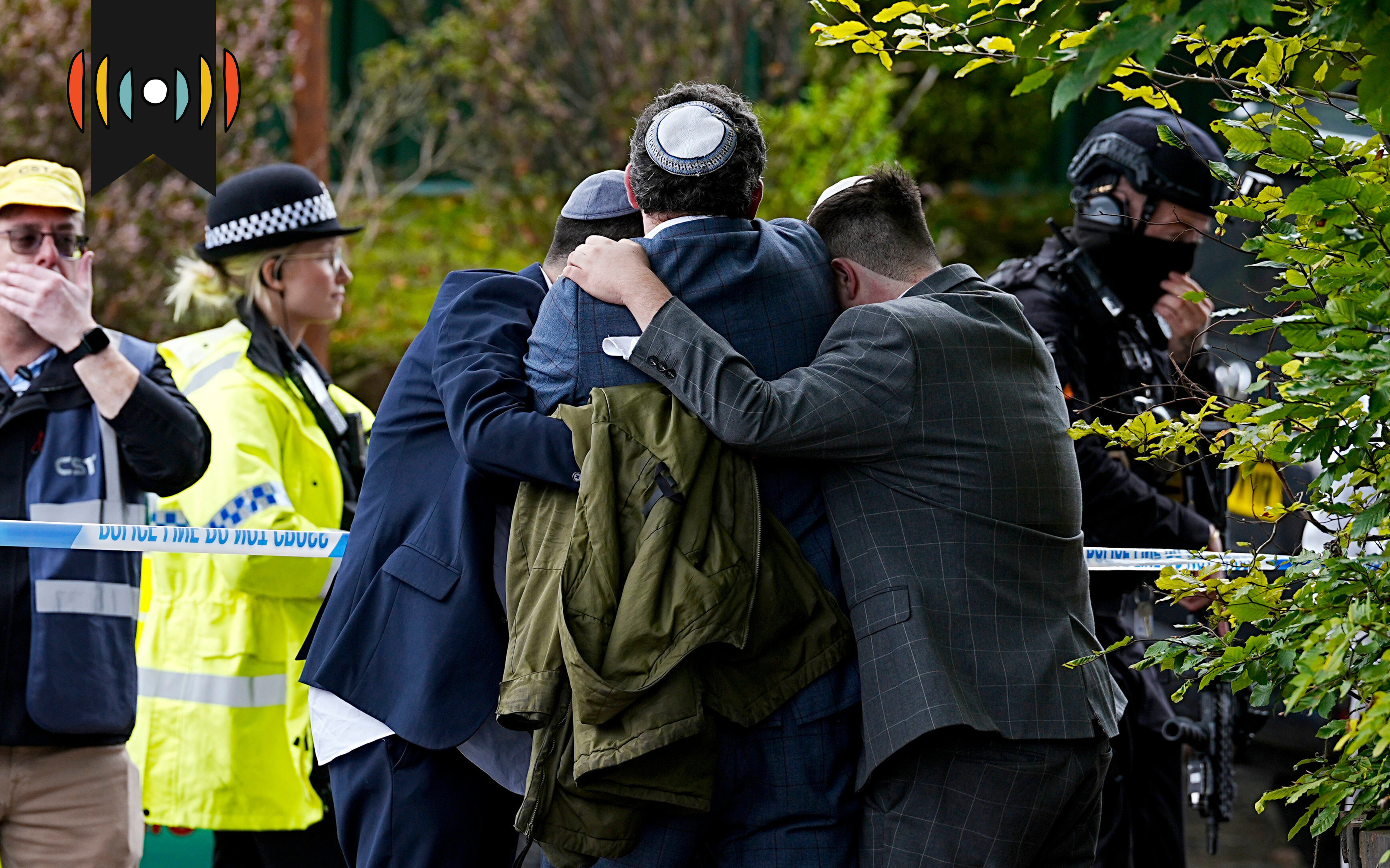 Members of the Jewish community comfort each other near to the Heaton Park Hebrew Congregation synagogue, in Crumpsall, Manchester, England, Thursday. Associated Press / Peter Byrne / PA